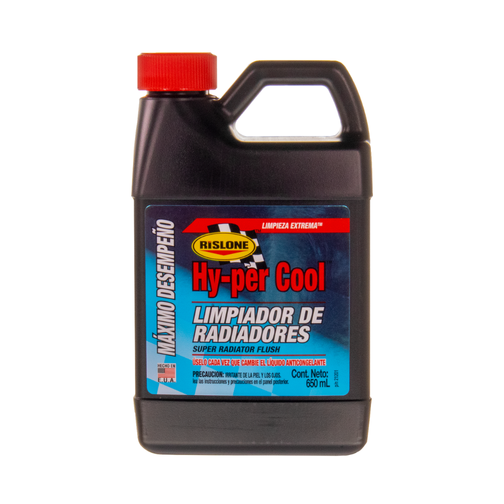 Rislone® Hy-per Cool™ Limpiador de Radiadores ayudará a remover depósitos que se acumulan con el tiempo en su sistema de enfriamiento, causando sobrecalentamiento. Su fórmula de alto rendimiento está especialmente diseñada para limpiar residuos de soldadura oxidada, residuos grasosos, óxido y escamas. Esta fórmula no ácida es apta para usarse en todos los tipos de sistemas de enfriamiento.